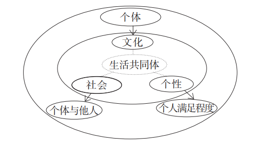 个体与他人层面。建立主体间性,是主体与客体达到理解包容的重要内容。主体间性就是个体通过对他者意图或语言的判别,最终形成个体间的统一。从文化角度来看,个体是承载一定信仰与价值体系的独立个体,语言是个体与他人交往的重要工具,语言也承载着文化、知识及价值信仰。个体与他人的共在就是在个体相互交往过程中达到价值观的一致。“一种互动要想成功地付诸实施,参与者相互之间就必须达成某种共识。而这种共识又取决于他们对待建立在充足理由基础上的要求所持的肯定或否定的立场。”[2]在一定的生活共同体中,人与人之间是通过语言确立共同的信仰与价值体系。从社会角度来看,个体与他人的交往既是一个相互适应的过程,也是适应组织规范的过程。从个性角度来看,个体通过相互间的共在,能够从社会化过程获得自身的满足感。