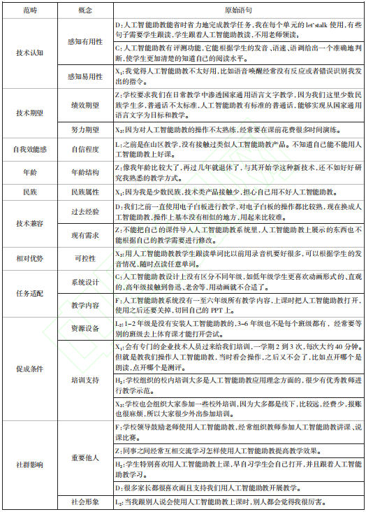 本研究过程遵循自下而上的研究体系,对10位访谈对象的访谈笔记开始初步处理,在客观真实的原则上,对原始资料进行逐字逐句分解,剔除无关内容,提取访谈中突出现象进行意义解释与建构,对相关资料进行逐级编码,概括出初始概念,梳理与研究概念相关的范畴,形成主范畴,进而构建民族地区教师人工智能助教应用意愿的影响因素模型。