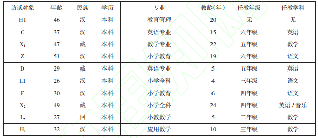 研究对象的选取遵循“目的性抽样”原则,即依据研究目的,抽取能为本研究提供较大信息量的研究对象。基于此,本研究以青海省海东市Q学校(该校共有1-6年级共计36个教学班,自2020年引入人工智能助教,在3-6年级的24个教学班累计安装人工智能助教21台,教师主要在语文、数学、英语三个科目的课堂教学中应用人工智能助教)的10位教师(见表1)为研究对象,围绕“民族地区教师人工智能助教应用意愿及影响因素”,对研究对象进行面对面半结构化一对一访谈,鼓励研究对象对人工智能助教的使用表达真实感受和想法。