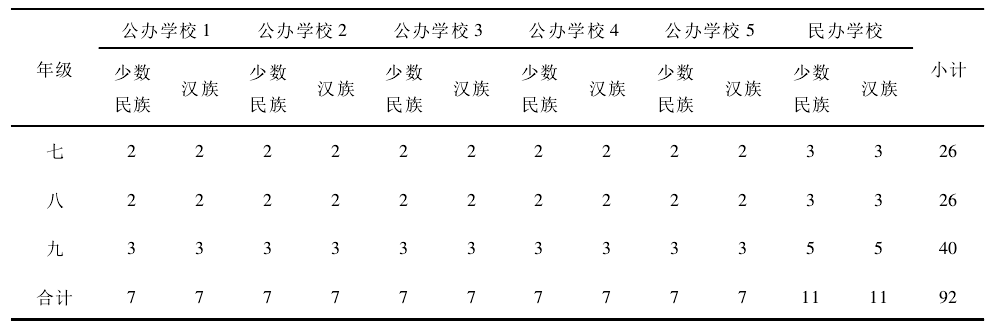第三,访谈。在第一步开展的量化分析的基础上,开展该区部分初中学生(汉族和少数民族)和初中数学教师的访谈,主要是以半开放式访谈为主。主要是回答“造成少数民族学生与汉族学生数学学习差异的原因可能是什么”的问题。随机抽取了该区5所公办初中学校和所民办学校,总计92名学生(见表1),其中汉族学生46名(男女生各一半),少数民族学生46名(男女生各一半)。七年级26名(少数民族13名,汉族13名,男女生各13名),八年级26名(少数民族13名,汉族13名,男女生各13名),九年级40名(少数民族20名,汉族20名,男女生各20名)。每次1名学生,访谈时间为15~20分钟。