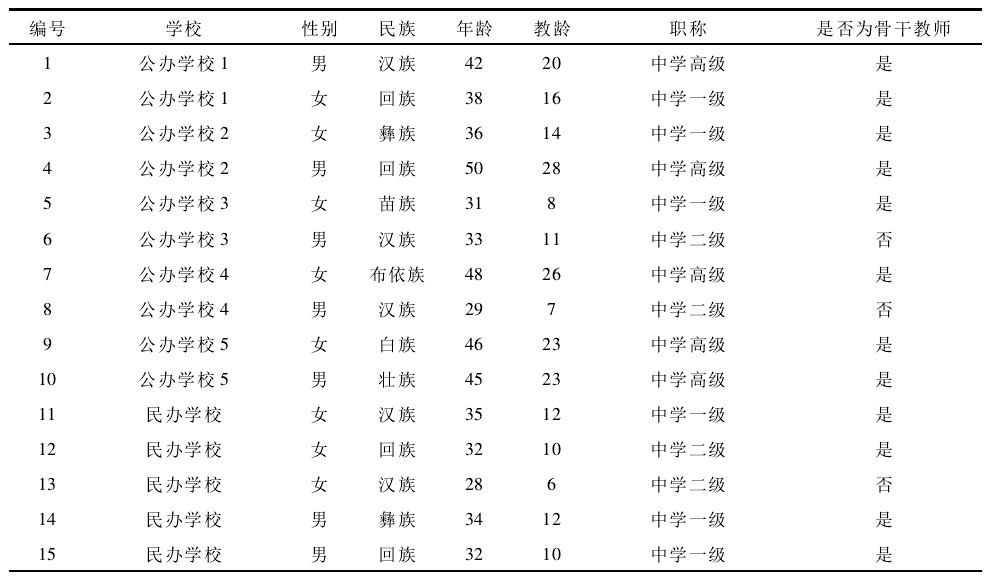 对初中数学教师的访谈,还是采取随机抽取上述5所公办初中学校和1所民办学校的初中数学教师15人(见表2),骨干教师占到被抽取教师的80%,都是具有丰富教学实践经验的初中数学教师,而且对该区的初中生群体、尤其是少数民族学生群体较为熟悉的初中数学教师,每次访谈1人,第次访谈时间为40~50分钟。