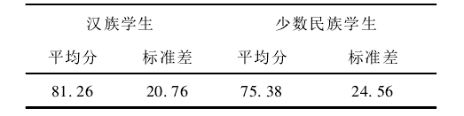 根据三年的学业质量调查数据,参加监测的学生为2426人,其中少数民族学生236人,占监测学生总数的9. 73%,2426名学生的数学平均分为76. 91,其中少数民族学生成绩分布的离散程度比汉族学生的稍大,少数民族学生的成绩稍低于汉族学生,但少数民族学生与汉族学生的数学成绩未达到统计学的显著差异水平(见表7)。