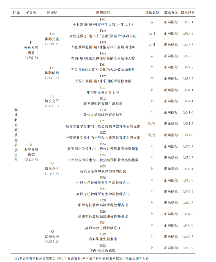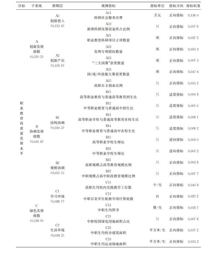 表1 职业教育高质量发展指数的指标体系