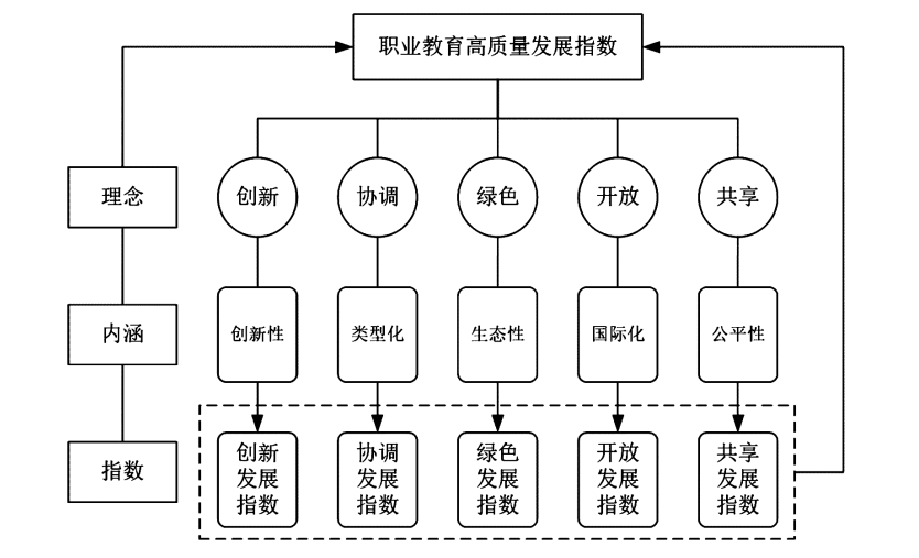 基于新发展理念,职业教育高质量发展是以满足人民日益增长的优质教育需要为目标的创新发展、协调发展、绿色发展、开放发展和共享发展。由此,职业教育高质量发展指数是集创新发展指数、协调发展指数、绿色发展指数、开放发展指数和共享发展指数等五个分项指数于一体的综合指数。其一,创新发展指数是职业教育高质量发展的动力指数,反映出职业教育高质量发展的创新性内涵。作为引领职业教育高质量发展的第一动力,创新发展是职业教育高质量发展的增长极,承载着开创职业教育新发展格局的时代使命。其二,协调发展指数是职业教育高质量发展的内生指数,彰显着职业教育高质量发展的类型化意蕴。职业教育作为一种类型教育,与普通教育处于同等地位,因而职业教育高质量发展要充分体现与普通教育的办学条件、办学水平、办学效益等的多方位协调发展。其三,绿色发展指数是职业教育高质量发展的生态指数,显现出职业教育高质量发展的生态性要义。职业教育高质量发展究其根本在于发展着学生的发展,为学生健康成才构筑优质的学习与生活环境是职业教育高质量发展的另一重深刻要义。其四,开放发展指数是职业教育高质量发展的特色指数,体现着职业教育高质量发展的国际化意义。开放发展是职业教育国际化发展程度的集中体现,主要表征为国际交流和国际输出水平。其五,共享发展指数是职业教育高质量发展的公平指数,突显出职业教育高质量发展的公平性涵义。共享发展反映了作为国民教育体系重要组成部分的职业教育享有与普通类型教育的同等地位,其核心要旨在于教育公平发展,具体包括教育机会公平、教育资源公平和教育结果公平。