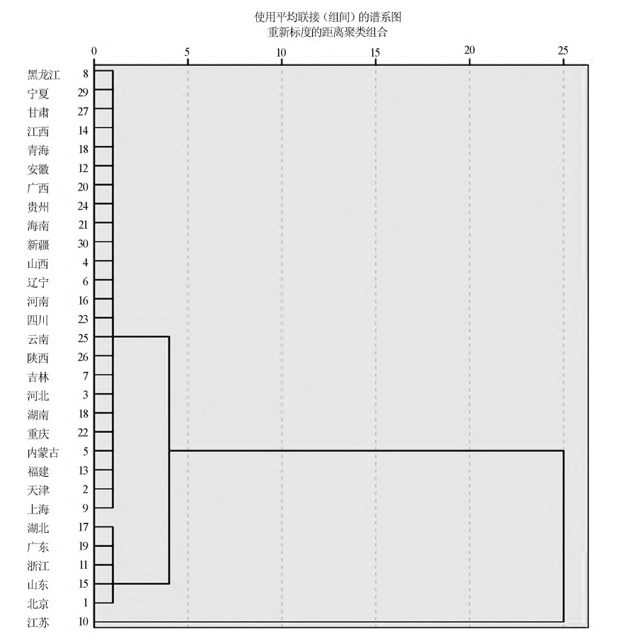 图2 2020年中国30个省份职业教育高质量发展指数聚类分析德谱系图