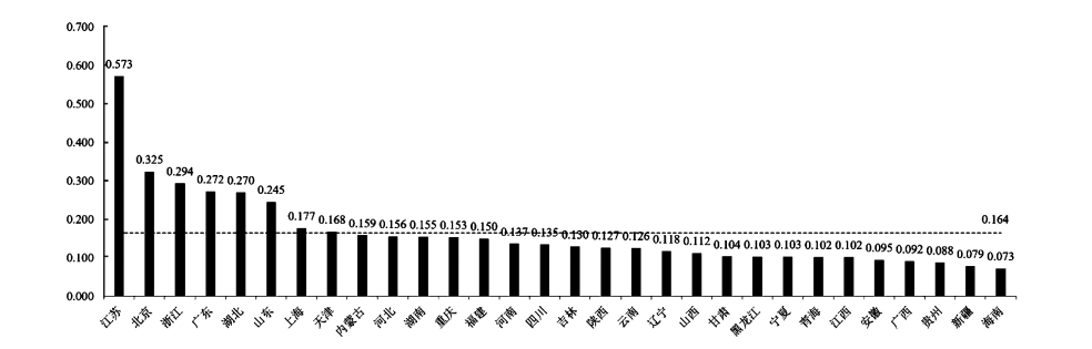 为直观体现职业教育高质量发展水平的省际空间分布格局,本研究基于层次聚类法中的组间联接法,利用SPSS26.0对2020年我国30个省份职业教育高质量发展指数测算结果进行系统聚类分析,发现职业教育高质量发展水平在空间分布格局上明显呈现出三类:第一类是江苏,第二类是北京、山东、浙江、广东、湖北等5个省份,第三类是上海、天津、福建、内蒙古、重庆、湖南、河北、吉林、陕西、云南、四川、河南、辽宁、山西、新疆、海南、贵州、广西、安徽、青海、江西、甘肃、宁夏、黑龙江等24个省份(如图2所示)。基于上述30个省份职业教育高质量发展指数系统聚类分析结果(见图2),并结合各省份职业教育高质量发展指数水平测算结果(见图3),可以发现2020年我国各省份职业教育高质量发展指数处于0.073~0.573;其中,指数最低的省份为海南省(0.073),指数最高的省份为江苏省(0.573),全国指数均值为0.164,表明2020年中国职业教育高质量发展指数整体偏低,且不同省份存在较为明显的水平差异,呈现出鲜明的空间分布“差序格局”。依据聚类分析结果和指数测算结果,我国30个省份职业教育高质量发展水平可划分为“领跑型”省份、“并跑型”省份、“跟跑型”省份三种类型。其中,“领跑型”省份为江苏省,其职业教育高质量发展指数显著高于全国指数均值,得益于江苏省对职业教育创新发展和开放发展的高度重视及其高等职业教育国际化水平走在全国前列[39];“并跑型”省份包括北京、浙江、广东、湖北、山东,这些省份高质量发展指数也都高于全国指数均值,但相比江苏省这一“领跑型”省份高质量发展水平稍显后进;“跟跑型”省份包括上海、天津、内蒙古、河北、湖南、重庆、福建、河南、四川、吉林、陕西、云南、辽宁、山西、甘肃、黑龙江、宁夏、青海、江西、安徽、广西、贵州、新疆、海南,且除天津和上海外其余各省份高质量发展指数不同程度地低于全国指数均值。总体而言,我国占比高达4/5的省份还未跨入职业教育高质量发展行列,尚处于从规模发展、数量发展向内涵发展、质量发展转变的过渡阶段之中,从空间分布格局来看中国职业教育高质量发展依然任重而道远。