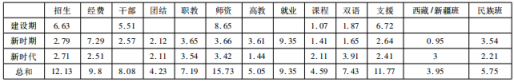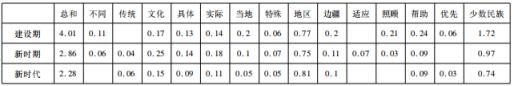 ③为了制表方便,笔者在表2中将“边远”“优惠”的加权百分比分别归入“边疆”“优先”。表3中,“沟通”“现代化”的加权百分比分别归入“合作”“现代”,“党中央”“中共中央”的加权百分比归入“中央”。