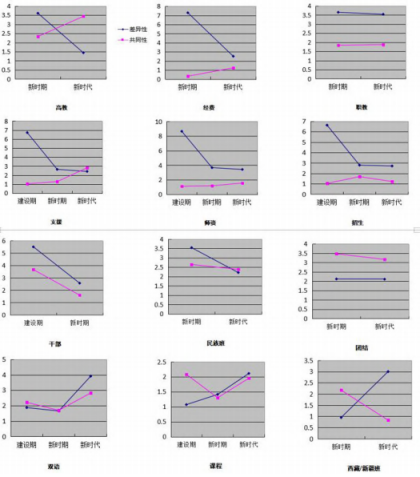 为了探明民族教育政策的文本对于差异性和共同性的反映情况,笔者选取了“不同”“传统”“文化”“具体”“实际”“当地”“特殊”“地区”“边疆”“边远”“适应”“照顾”“优惠”“优先”“少数民族”作为反映差异性的词语,“共同”“共同体”“联系”“合作”“沟通”“交流”“交融”“统一”“领导”“思想”“中华民族”“中央”“中国”“国家”“中共中央”“党中央”“祖国”“现代”“现代化”“社会主义”作为反映共同性的词语,进而查询这些词语的加权百分比。笔者认为,采取这种选取方法,虽然带有一定的主观性,但根据这些词语出现频率的大小来分析差异性和共同性,较之通过对政策内容的解读来加以分析似乎更为客观一些,也或许会有另一种收获。如表2、表3③所示,历史地看,民族教育政策“差异性”关键词的加权百分比的总和从4.01下降为2.28,“共同性”关键词的加权百分比的总和从1.7增长为2.74。换言之,新中国成立以来,民族教育政策的演进表现出增进共同性和尊重、包容差异性的历史趋势。这恰好与习近平总书记强调的“按照增进共同性的方向改进民族工作,做到共同性和差异性的辩证统一”相吻合,也意味着民族教育政策在总体上与党的民族工作路线保持了高度一致。通过对文献的细致整理与分析,发现具有以下几个特点: