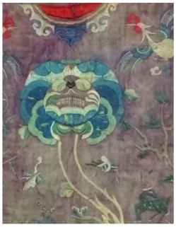 从现今的仫佬族背带和百年前的对比发现都是使用剪纸贴花绣,但是原来的老绣片针法丰富多样,综合运用了平绣、剪纸贴花绣、线迹绣、结粒绣、轮廓绣等多种针法组合(见图18),近20年的绣法比较单一,只有剪纸贴花绣和简单的线迹绣(见图17)。