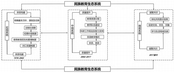 Findings show that the evolution of China 's ethnic education policy in terms of its concerns and gradual improvement of the educational ecosystem in different historical periods since 1978 can be divided into three time spans : 1) From 1978 to2002 which was the period of“reform and opening up contributed to the construction of a macro educational system”. In this era,China's ethnic education policies were mainly focusing on the construction of a macro educational system as well as corresponding specific policy system. 2) From 2002 to2017 which was a leapfrog development period of“concentrating on the build quality of the meso-educational system”. During this phase,the quantity and quality of educational resources in China's ethnic areas were further improved,the gap of education quality between ethnic areas and other regions was gradually narrowed,the planning and design of scientific research in China 's ethnic areas became more scholarly and logical,and intellectual support also was increased. 3) From 2017 to now can be defined as the period of“forming the consensus of a sense of community for the Chinese nation on a micro-educational level”. In this period of time,this cultivation of a sense of community for the Chinese nation among teachers and students of all ethnic groups further strengthened and deepened. Various Minzu colleges and universities have been carrying out diversified activities such as themed exchange activities,social practice activities,and voluntary service work to further promote communication,exchange,and integration among ethnic youth.