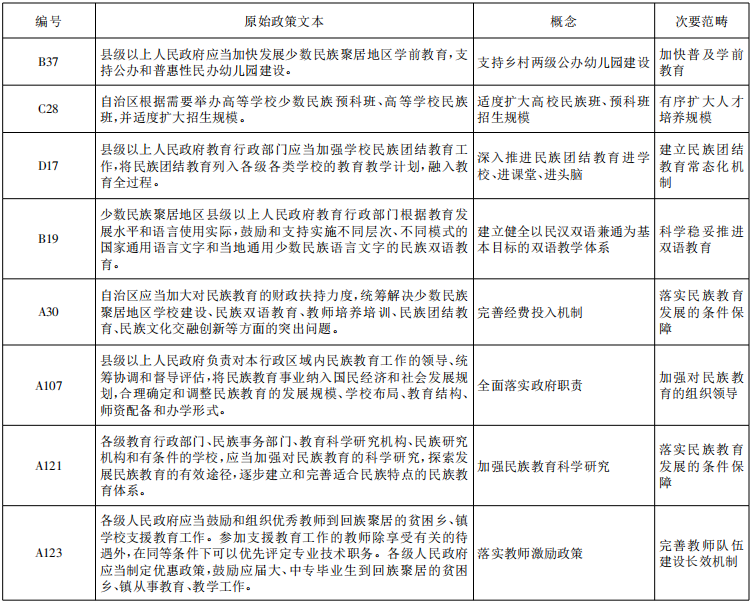 政策文本不仅仅是政策实践的静态反映,也会在一定层面上对政策的执行产生动态的干预,它不仅能够反映出现存于自然界和人类社会中的物体、时间和范畴,与此同时,也在积极地构建着世界的面貌。[7]因此,对我国民族教育政策文本进行分析可以为我们深入了解政策的制定、执行和废止的整个生命周期,以及政策关注焦点的变迁规律提供支点。与此同时,通过对政策文本进行扎根分析也有利于构建本土政策理论,从而促进对于我国民族教育政策及其发展过程的深入理解。[8]