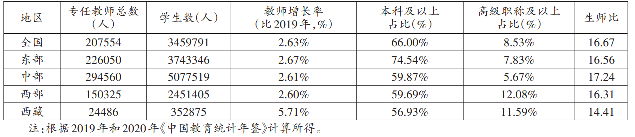 表3 2020年西藏与东、中、西部地区人力资源配置对比(小学)