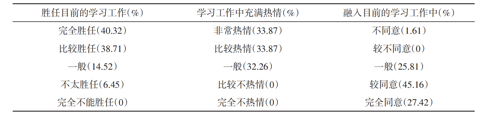 5.政策目标实现度。《骨干计划》的实施对于促进我国西部大开发、民族地区经济社会发展、增强民族团结和维护国家统一等方面都起到了重要作用。同时,自该计划实施以来,它也改变了许多少数民族学生的命运。根据表3的数据显示,许多少干研究生在学习工作中表现出积极的态度,其中学习工作比较热情以上的占67.74%。在调查中,72.58%的被调查者认为自己已经融入了当前的学习工作中。在学习工作中,有79.03%的少干研究生认为自己能够胜任当前的学习工作,只有6.45%的人认为自己不太胜任当前的学习工作,见表3。