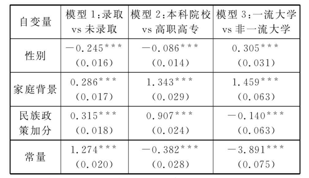 注:表中***分别代表0.01的显著水平,括号内是标准误差,括号外是估计系数值。自变量的参照变量依次为:女生、农村学生、未加分,因变量的参照变量依次为:未录取、其他院校、非一流大学,且标记为0。