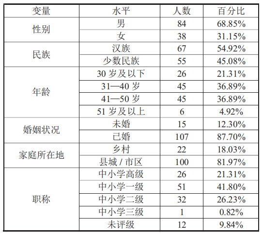 考虑到民族地区的典型性和代表性,以及当地民族种类的覆盖面,本文选取四川、云南和贵州三个省份的民族地区乡村教师为调查对象。共调研乡村中小学25所,访谈乡村教师122人。其中,男教师84人,女教师38人;汉族教师占54.92%,少数民族教师占45.08%,具体情况参见表1。