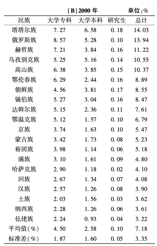 由表6(A)和(B)比较可知,即使在高等教育发展较为充分的民族中,仍然存在较大的差异,且有不断扩大的趋势。高等教育阶段人口占比的标准差从2000年的3.35%上升至7.77%。2000年排名第一的塔塔尔族和排名第二十的仫佬族相差10.81%,而2020年排名第一的俄罗斯族和排名第二十的普米族则相差25.47%。我国各民族人口在高等教育阶段的发展还有待进一步提升。