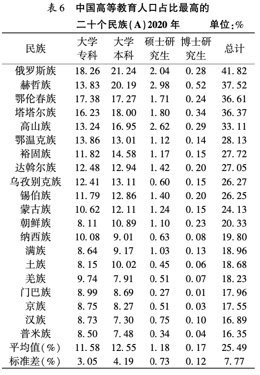 表6的(A)和(B)分别列举了2020年和2000年我国高等教育人口占比最高的20个民族。2000—2020年,这些民族的高等教育均有长足发展,高等教育人口占比的平均值从7.18%上升至25.49%。由表6(A)可知,2020年我国部分民族的高等教育人口占比已达到较高水平,超过30%的民族有俄罗斯族、赫哲族、鄂伦春族、塔塔尔族和高山族。
