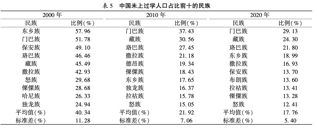 表5列举了2000—2020年未上过学人口占比最高的10个民族,其平均值从40.34%下降至17.76%,标准差从11.28下降至5.40%。这些民族在2000-2020年,其未上过学的人口占比均有显著下降,东乡族从57.96%下降到18.99%,保安族从49.10%下降到13.70%,体现了党和国家对各民族基本受教育权利的充分重视。各普查年份未上过学人口占比前十的民族变动较小,门巴族、东乡族、珞巴族、藏族、撒拉族、怒族、傈僳族始终排名前十。