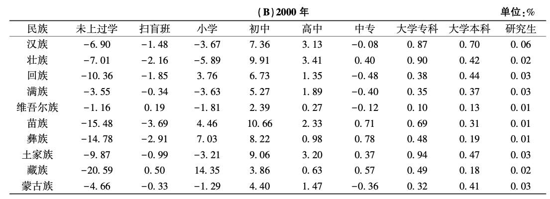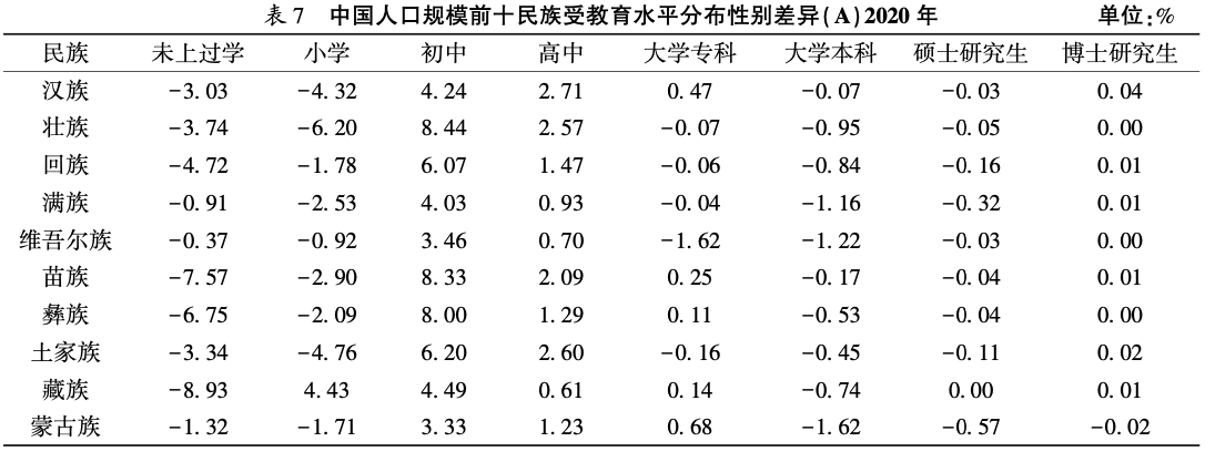 表7的(A)和(B)分别列举了2020年和2000年人口规模前十民族受教育水平分布性别差异。⑦2000—2020年人口规模排名前十的民族在各教育级别上的性别差异均有大幅缩小,⑧在未上过学的阶段上尤其显著。如在未上过学的阶段上,2000年藏族女性人口占比较男性人口高20.59%,至2020年下降为8.93%;2000年汉族女性人口占比较男性人口高6.90%,至2020年下降为3.03%。