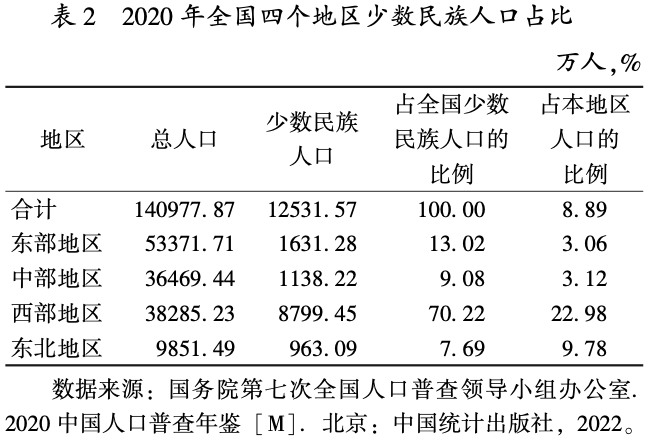 进入21世纪以来,我国少数民族人口数量从1.04亿增长到1.25亿。我国东部、中部、西部和东北四个地区民族人口占比呈现两种不同的变化。西部地区少数民族人口最多,但占全国民族人口比重逐步降低,从2000年的71.3%、2010年的71.01%,下降到2020年的70.22%;中部地区少数民族人口占全国民族人口比重也呈现逐步降低趋势,从2000年的10.32%、2010年的9.58%,下降到2020年的9.08%;东北地区少数民族人口变动比较剧烈,不仅少数民族人口数量减少,且占全国少数民族人口比重下降较快,从2000年的10.48%、2010年的9.06%,下降到2020年的7.68%。从下降趋势看,东北地区下降速度最快,中部地区次之,西部地区缓慢下降。东部地区少数民族人口变动趋势与其他三个地区相反,少数民族人口数量呈现大幅增长态势,占全国少数民族人口比例也快速提高,占比从2000年的7.91%、2010年的10.35%,提高到2020年的13.02%。2010—2020年,全国人口年均增长0.53%,少数民族人口年均增长0.98%,东部地区少数民族人口年均增长达到4.00%,是全国少数民族人口年均增长率的4.08倍,是全国总人口年均增长率的7.55倍。2020年全国四个地区少数民族人口数量及占全国少数民族人口的比重,详见表2。