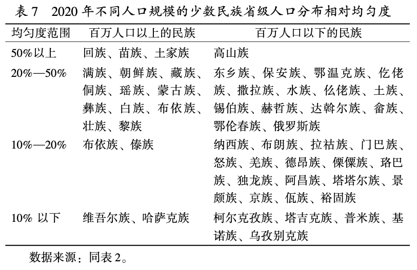 (2)各少数民族人口分布相对均匀度的提高,其成因可以分为“各地区间分布趋向均匀”及“地区间分布趋向均匀和居住地区增多两种因素并存”两种类型。从省级人口分布方面来考察,2010—2020年间我国少数民族省级人口分布相对均匀度提高3.59个百分点,有43个少数民族的省级人口分布相对均匀度提高,12个少数民族的省级人口分布相对均匀度下降。在43个省级人口分布相对均匀度提高的民族中,其中36个民族2010年、2020年在31个省(直辖市、自治区)都有人口分布,它们的省级人口分布相对均匀度的提高,成因是这些少数民族人口在31个省(市、自治区)的“地区间分布趋向均匀”;其他7个少数民族省级人口分布相对均匀度提高的成因包括两方面:一是该民族各地区人口占该民族总人口的比重趋向平均,二是该民族居住地区增多,是“地区间分布趋向均匀和居住地区增多两种因素并存”所造成的。