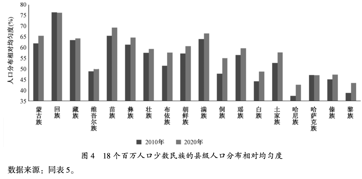 2010—2020年,我国少数民族总体的县级相对人口分布均匀度提高了2.87个百分点。在55个民族中,49个少数民族的相对人口分布均匀度有所提高,其中,仫佬族提高10个百分点以上,京族、怒族、赫哲族、塔塔尔族、回族、哈萨克族6个少数民族县级人口分布相对均匀度有所下降。
