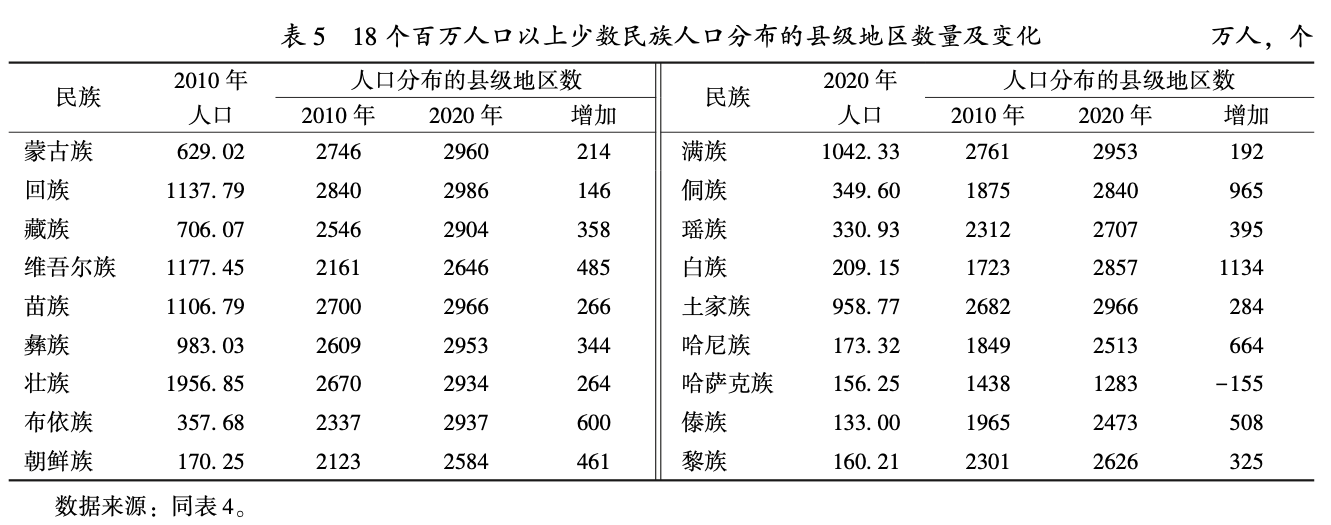 从2010—2020年,我国18个百万人口以上民族中的17个民族有人口分布的县级地区数量呈现增长态势。增长数量最高为白族,达到1134个;侗族和布依族增长量排在第二、三,增长数量分别为965个、600个。18个百万人口以上少数民族人口分布的县级地区数量及变化见表5。