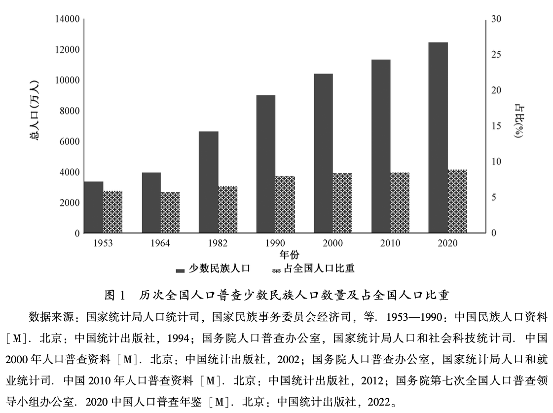1949年以来,我国少数民族人口数量增速较快,占全国总人口的比重也逐步提高。历次人口普查全国少数民族人口数量及占全国总人口的比重见图1。