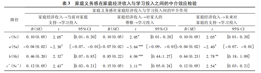 如表3所示,家庭经济收入显著正向预测学习投入,c=0.10,p=0.04;家庭经济收入显著负向预测当前对家庭支持,a=-0.04,p=0.03;同时纳入家庭经济收入和当前对家庭支持后,家庭经济收入显著正向预测学习投入,c’=0.12,p=0.02;当前对家庭支持显著正向预测学习投入,b=0.46,p=0.02。偏差校正的百分位Bootstrap方法检验表明,当前对家庭支持在家庭经济收入与学习投入之间的中介作用显著,ab=-0.02,Boot SE=0.01,95%CI[-0.05,-0.001]。中介效应占总效应的比例为ab/(ab+c’)=19.18%。家庭经济收入显著负向预测对家人的尊敬,a=-0.07,p<0.001;同时纳入家庭经济收入和对家人的尊敬后,家庭经济收入显著正向预测学习投入,c’=0.15,p=0.002;对家人的尊敬显著正向预测学习投入,b=0.85,p<0.001;偏差校正的百分位Bootstrap方法检验表明,对家人的尊敬在家庭经济收入与学习投入之间的中介作用显著,ab=-0.05,Boot SE=0.02,95%CI[-0.09,-0.02]。中介效应占总效应的比例为ab/(ab+c’)=51.34%。家庭经济收入显著负向预测未来对家庭支持,a=-0.04,p=0.02;同时纳入家庭经济收入和未来对家庭支持后,家庭经济收入显著正向预测学习投入,c’=0.12,p=0.01;未来对家庭支持显著正向预测学习投入,b=0.64,p=0.006。偏差校正的百分位Bootstrap方法检验表明,未来对家庭支持在家庭经济收入与学习投入之间的中介作用显著,ab=-0.02,Boot SE=0.01,95%CI[-0.06,-0.002]。中介效应占总效应的比例为ab/(ab+c’)=23.81%。