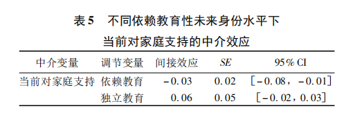 依据方程1的检验结果,采用简单斜率进一步分析依赖教育性未来身份的调节作用,如图1所示,未来身份依赖教育条件下,当前对家庭支持显著正向预测学习投入(B=0.75,SD=0.21,p<0.001,95%CI[0.33,1.18]);未来身份独立教育条件下,当前对家庭支持不能显著预测学习投入(B=-0.17,SD=0.24,p=0.43,95%CI[-0.65,0.30])。最后考察在调节变量不同水平下的中介效应,如表5所示,家庭经济收入通过当前对家庭支持对学习投入的间接影响受到依赖教育性未来身份的调节,与未来身份独立教育条件相比,家庭经济收入在未来身份依赖教育条件下通过当前对家庭支持对学习投入的间接影响更大。